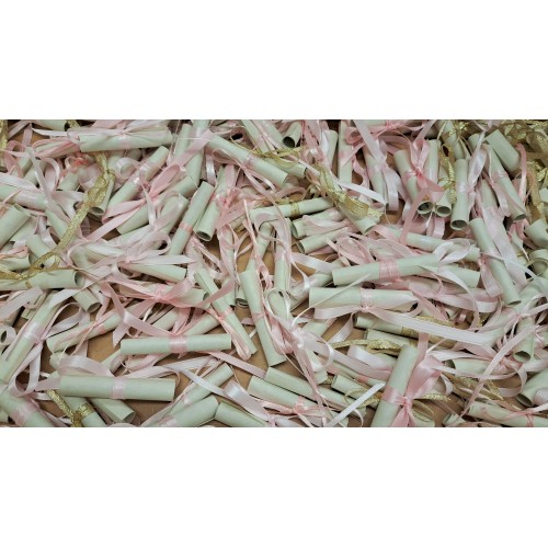 Don't want to spend a lot of money but want a cute idea for capturing your customers attention... These scrolls are not only a bargain but they come with the color paper of your choice. They are rolled and can be secured with a rubber band, plastic tube, jump ring or tied with a ribbon. Great for when your need a large quantity with a limited budget.
