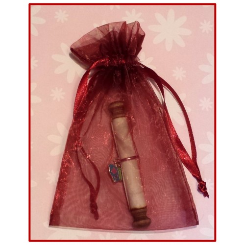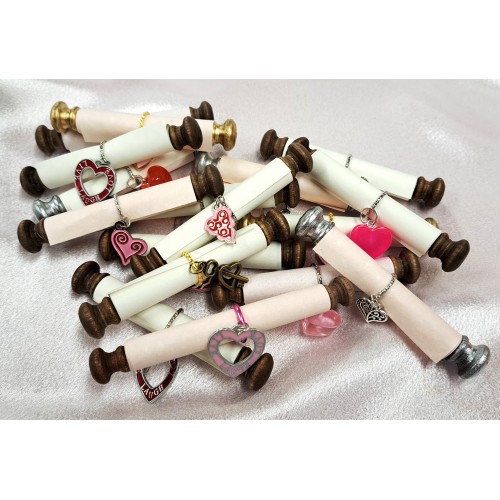 A little scroll that is perfect for inviting your loved one to a special dinner or event. These are available in white or pink parchment and comes with a cute heart charm that slides to the end of the scroll. Unroll scroll - read the message - and slide the jump ring back in place to secure the paper from unrolling.