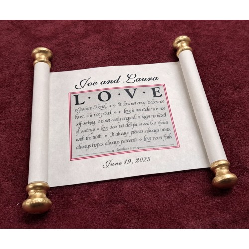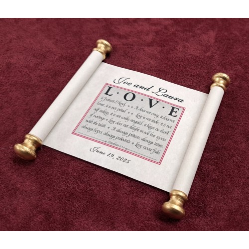 This "3 x 5 LOVE Rolled Scroll" looks real classy printed on white parchment paper and finished with our gold finials. It does not have burned edges giving it a contempory look. This "LOVE Rolled Scroll" can be personalized with name/names.