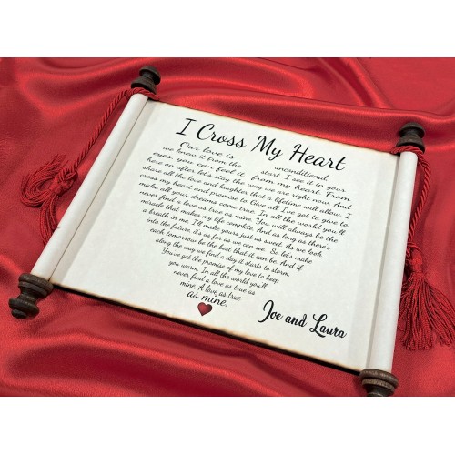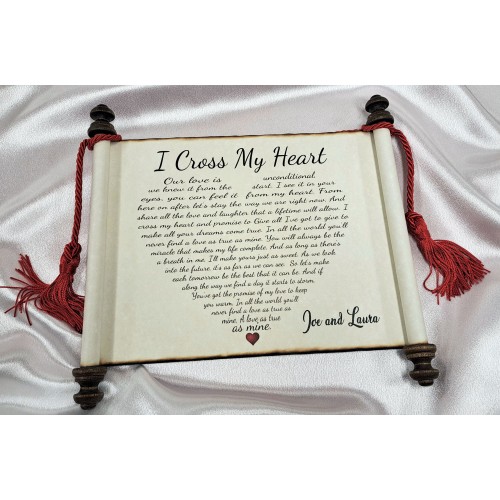"I Cross My Heart Scroll Plaque" is 8 1/2 x 11 inches and comes printed on natural cream parchment with walnut stain finials and a wood backing for easy hanging. Have it "Personalized" with your names.