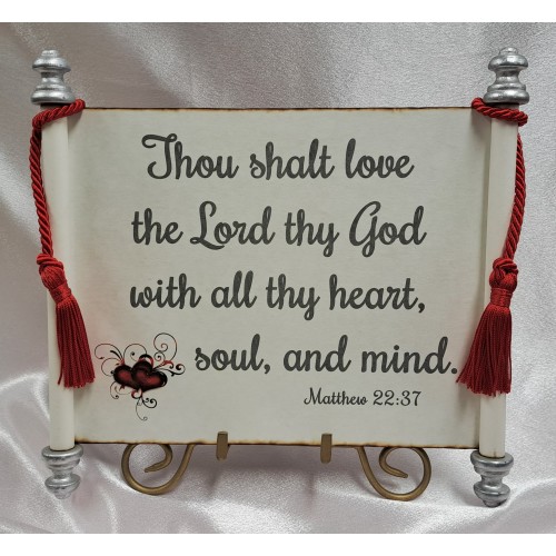 Encourage LOVE with this 8 1/2 x 11 classy "Thou Shalt LOVE Scroll Plaque". It is a beautiful plaque printed on white parchment paper with silver finials and a wood backing for easy hanging. It can easily be displayed for Valentine's Day (or all year)! Hang on a door (can be added to a wreath) or display on one of our 10" Decorative Easels.