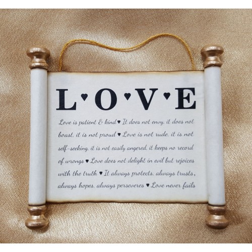 This "LOVE Ornament" is 3" x 5". It is printed on white parchment and finished with our classy gold finials. Can be hung up on a wall - at someone's desk or used on a Christmas Tree. Hang your LOVE for all to see!
