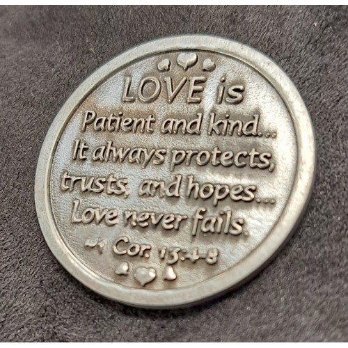 The front has a rose and the back has I Corinthians 13.