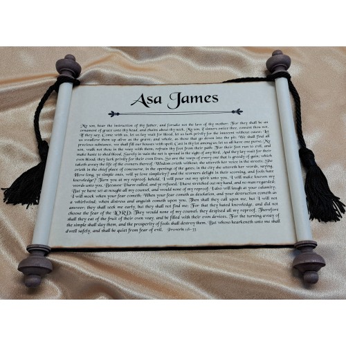 This beautiful 8 1/2 x 11 "Scroll Plaque" makes a beautiful BarMitzvah keepsake that can be hung on the wall. Verse on the scroll is Proverbs 1:8-33 (My son, hear the instruction of thy father...)